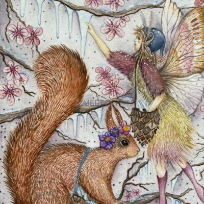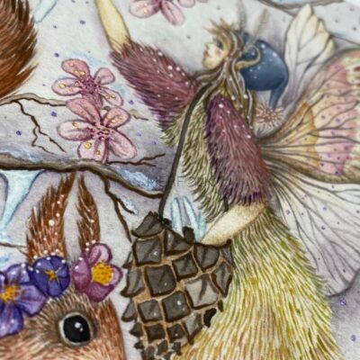 This cosy forest fairy is collecting icicles with her squirrel friend, to melt and provide water for all their forest companions during a frosty cold snap. This was inspired by something we will always do when there is a big freeze when water can be scarce. We leave a bowl of tepid, shallow water out for all the birds and creatures to drink from, just incase their watering holes are frozen.
